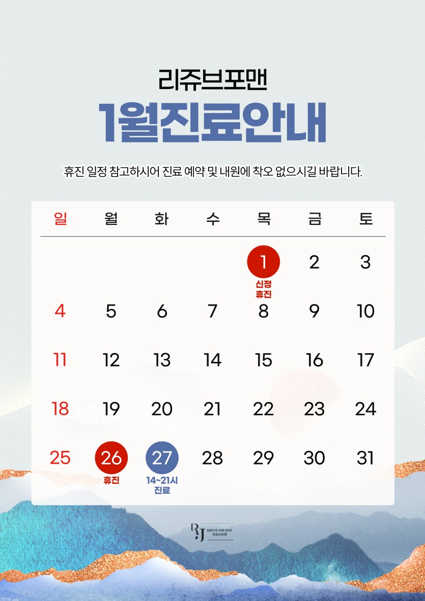 공지사항 2026년 1월 진료일정 입니다 :) 페이지 정보 작성자 리쥬브포맨 댓글 0건 조회 77회 작성일 25-12-30 14:46 본문 새해 복 많이 받으세요 ♡ 목록 이전글2026년도 전체 휴진일정 26.01.06 다음글12월 휴진 일정입니다 :) 25.12.04 댓글목록 댓글목록 등록된 댓글이 없습니다.
